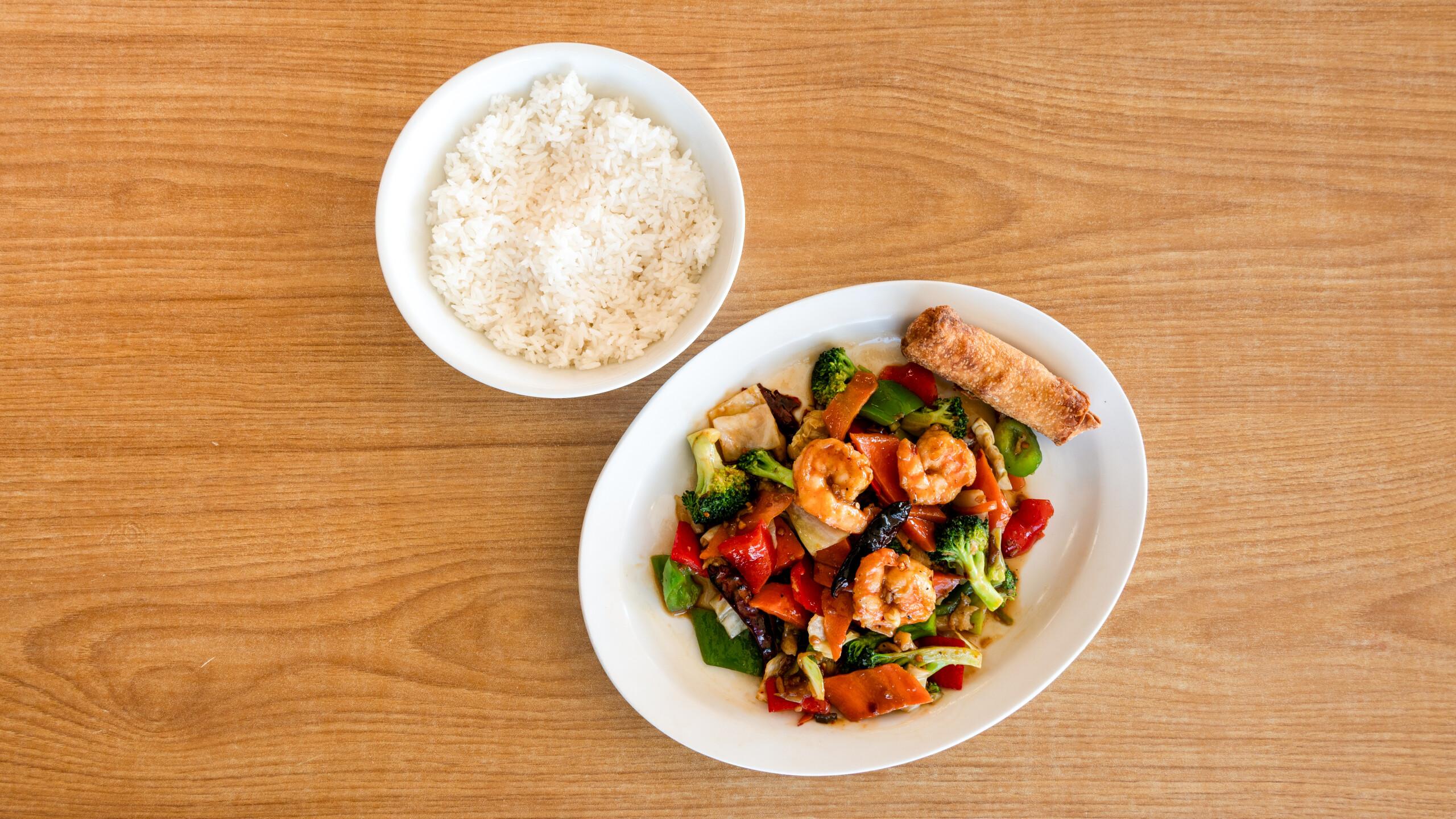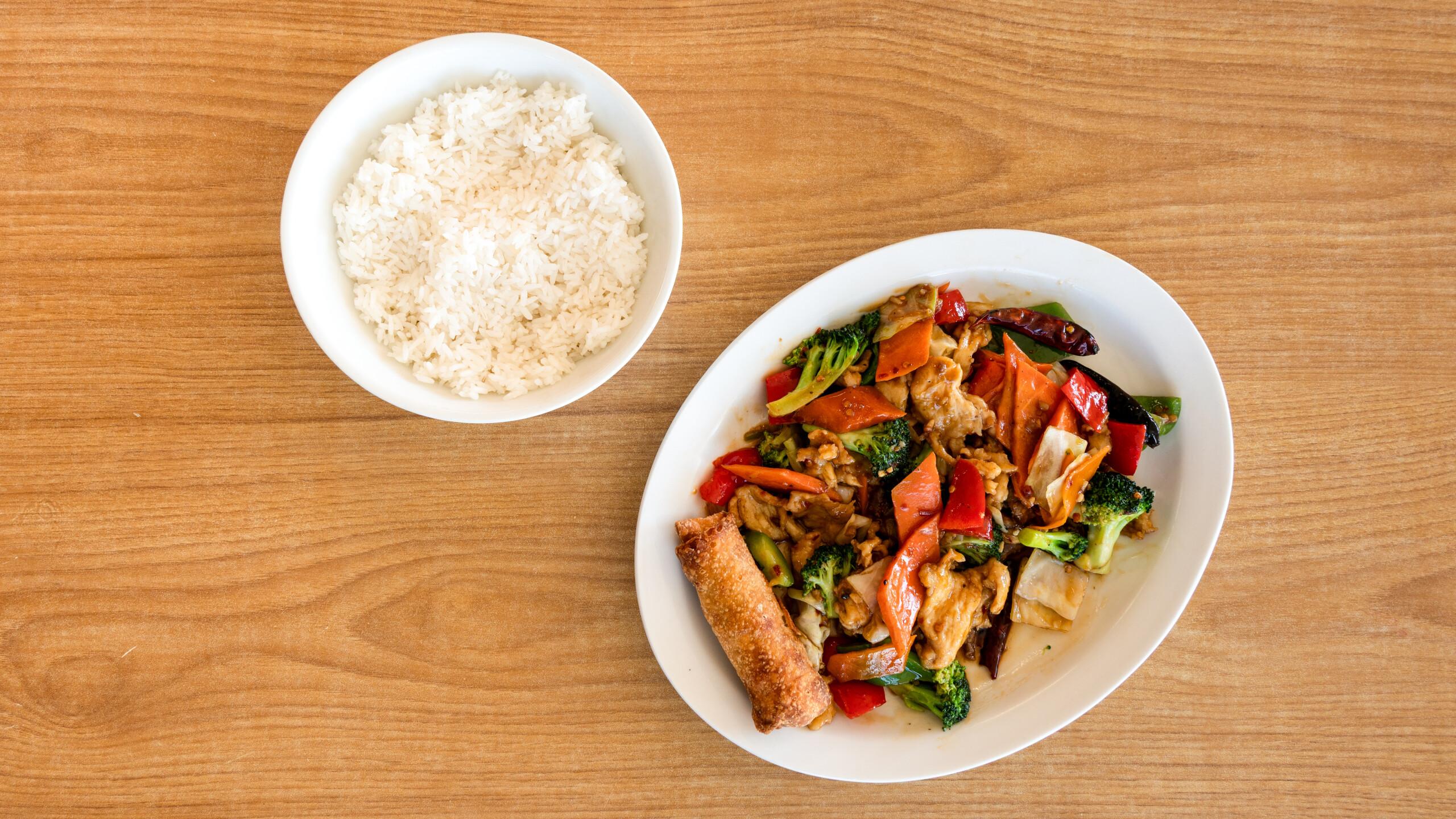 Cabbage, bell peppers, carrots, and broccoli in Hunan sauce.🌶