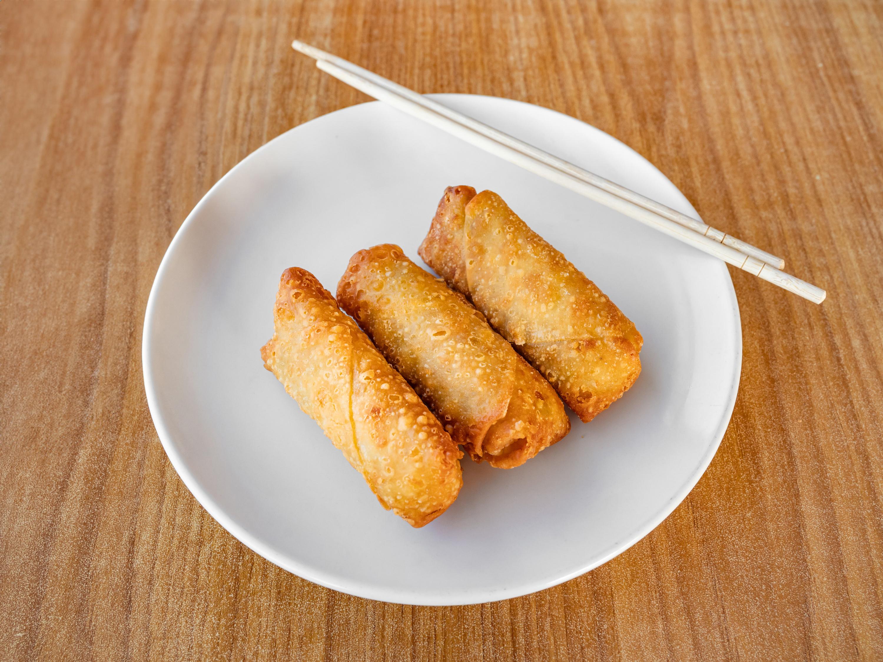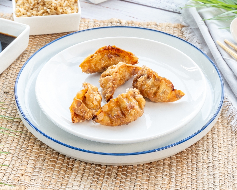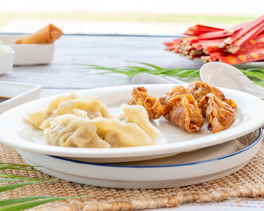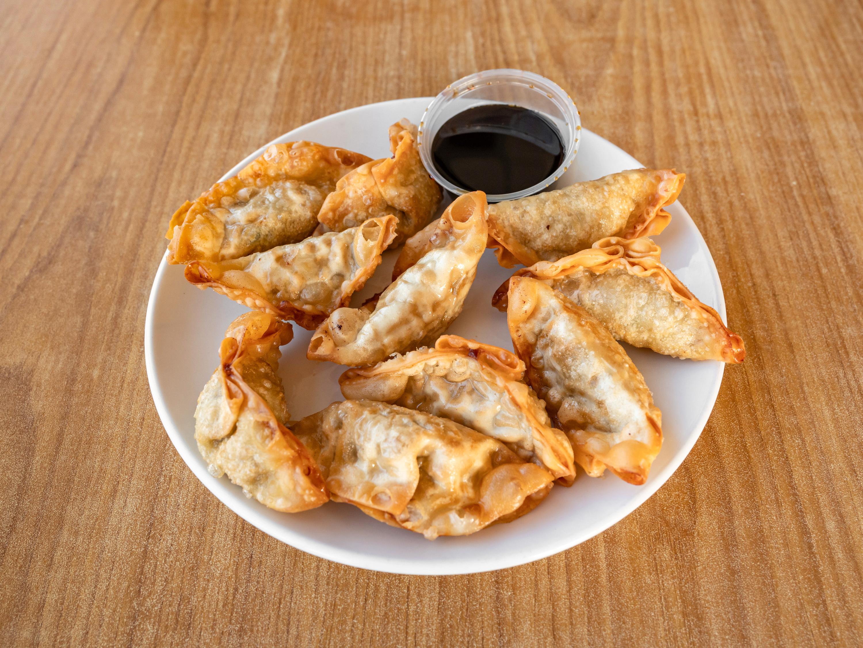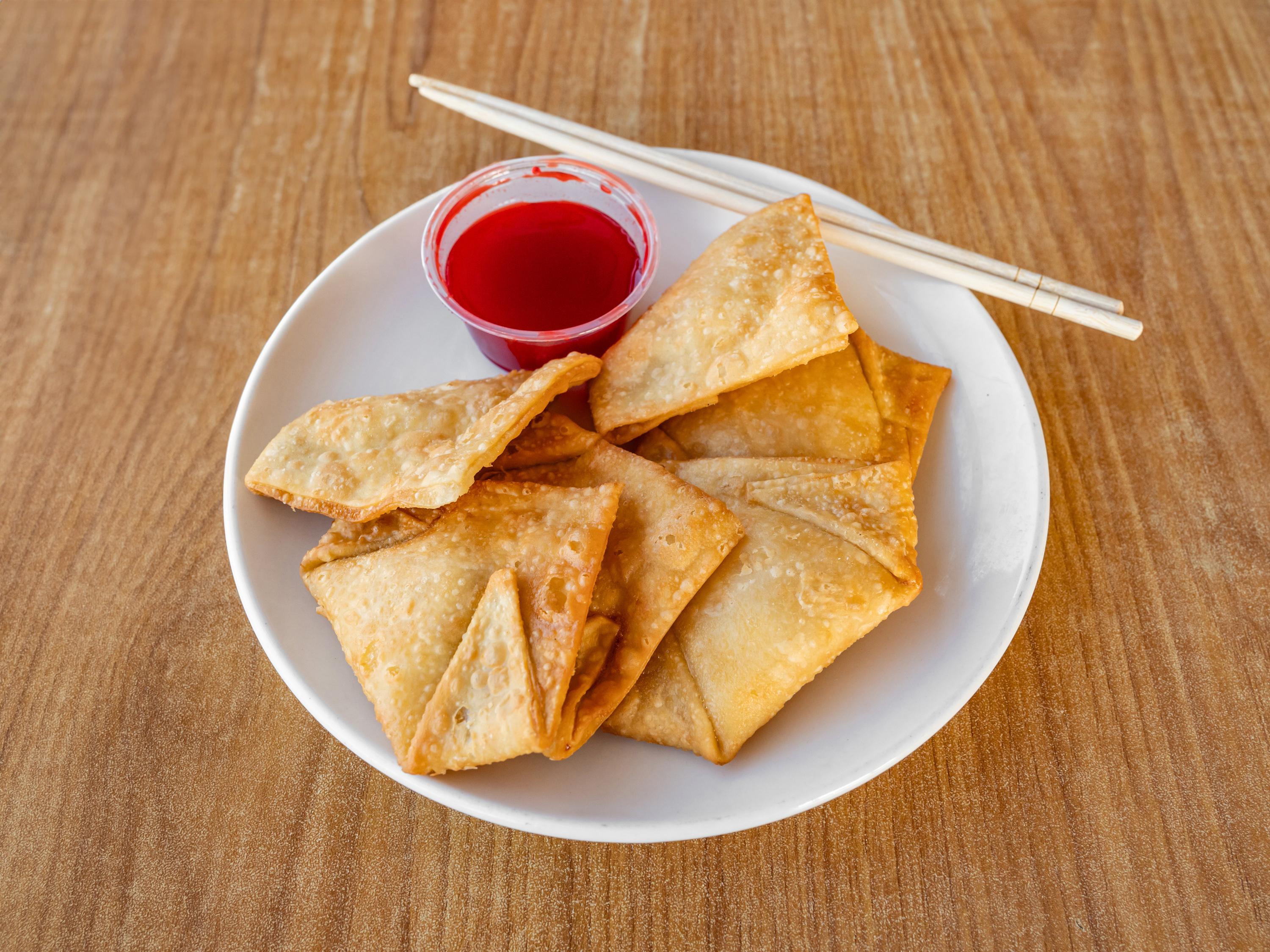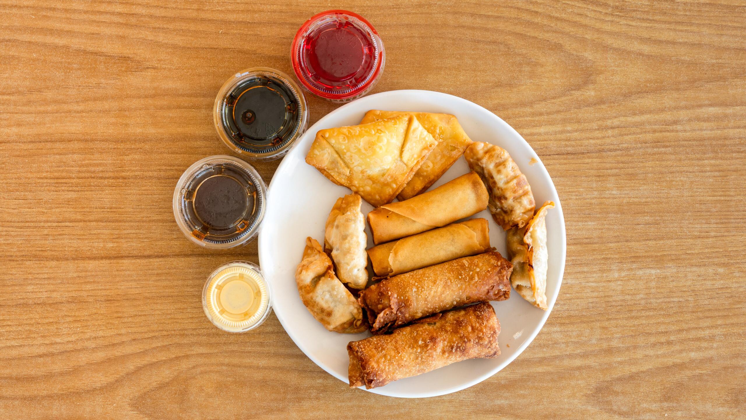 Spring rolls (2), egg rolls (2), crab rangoons (2), and fried dumplings (4).
