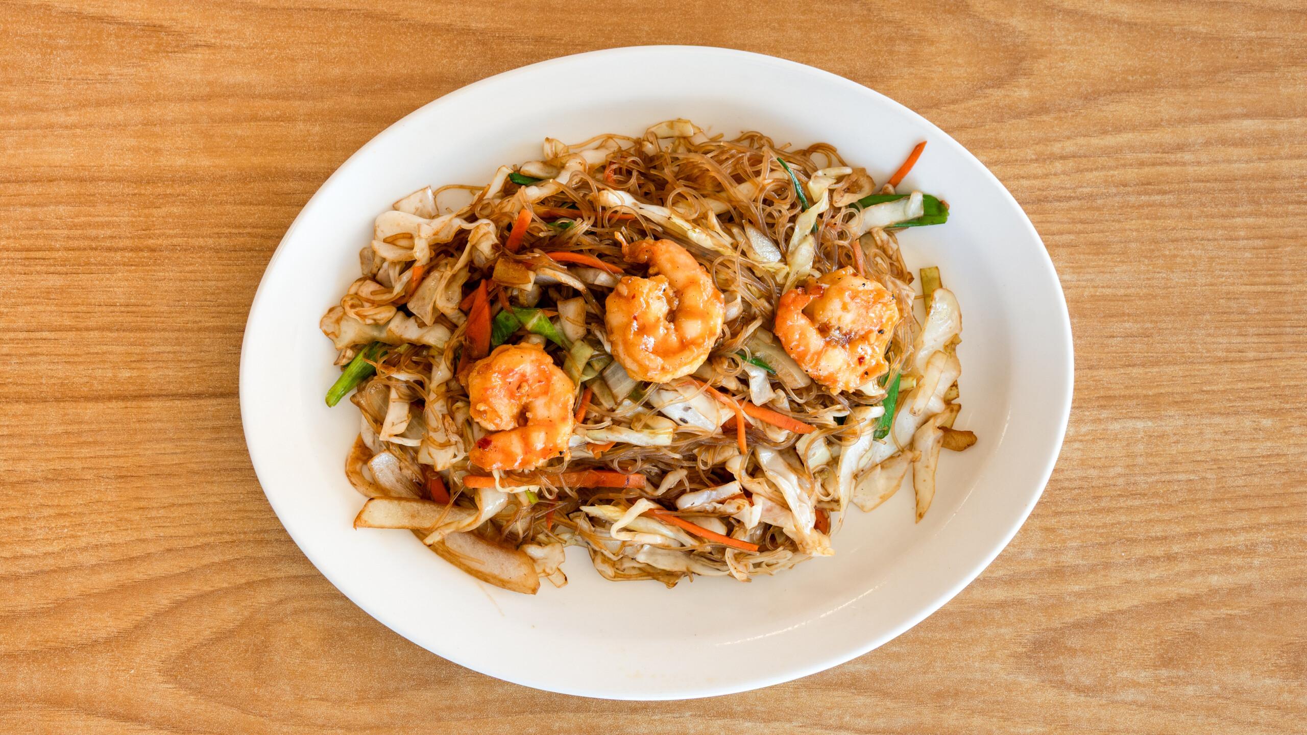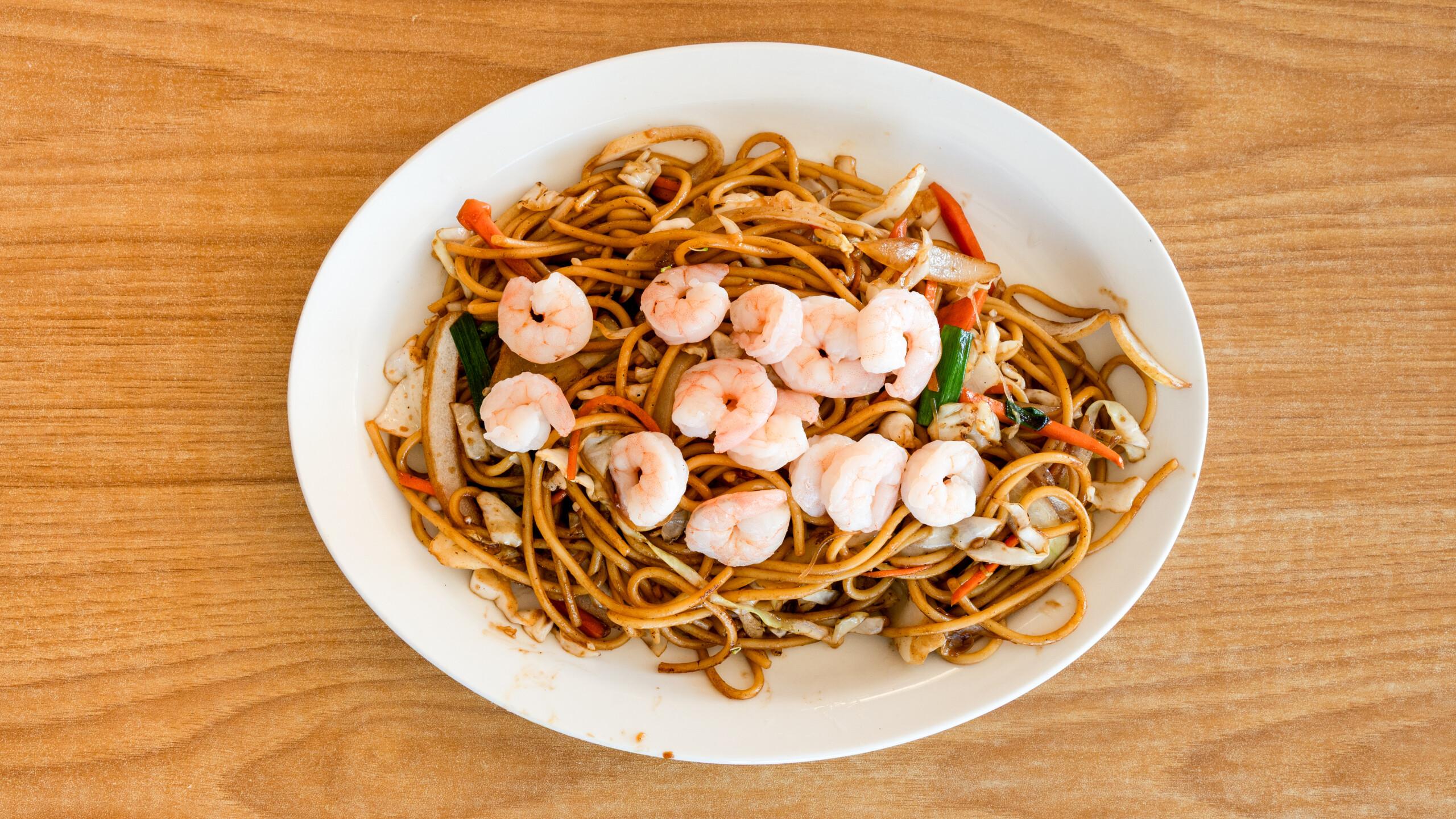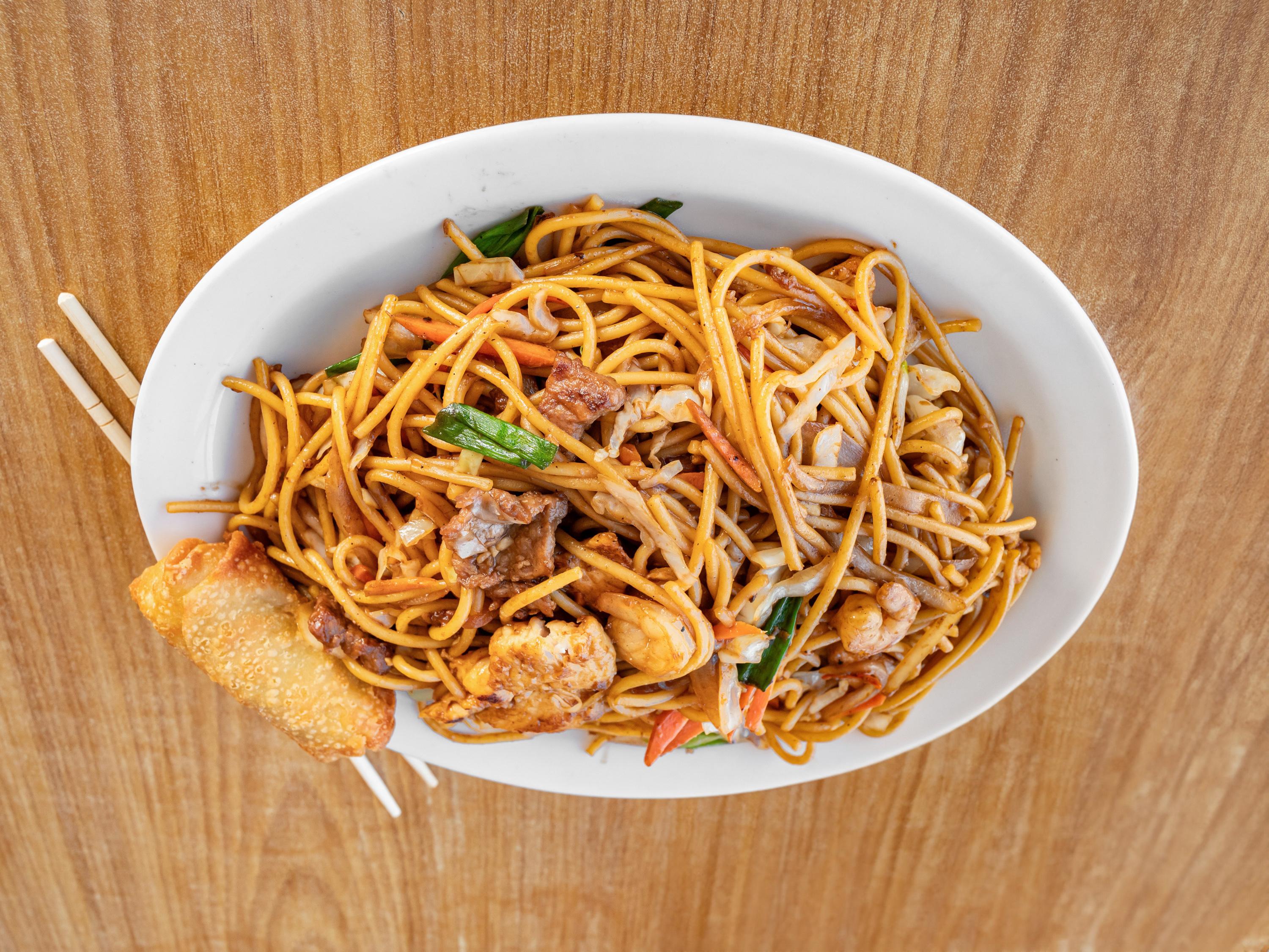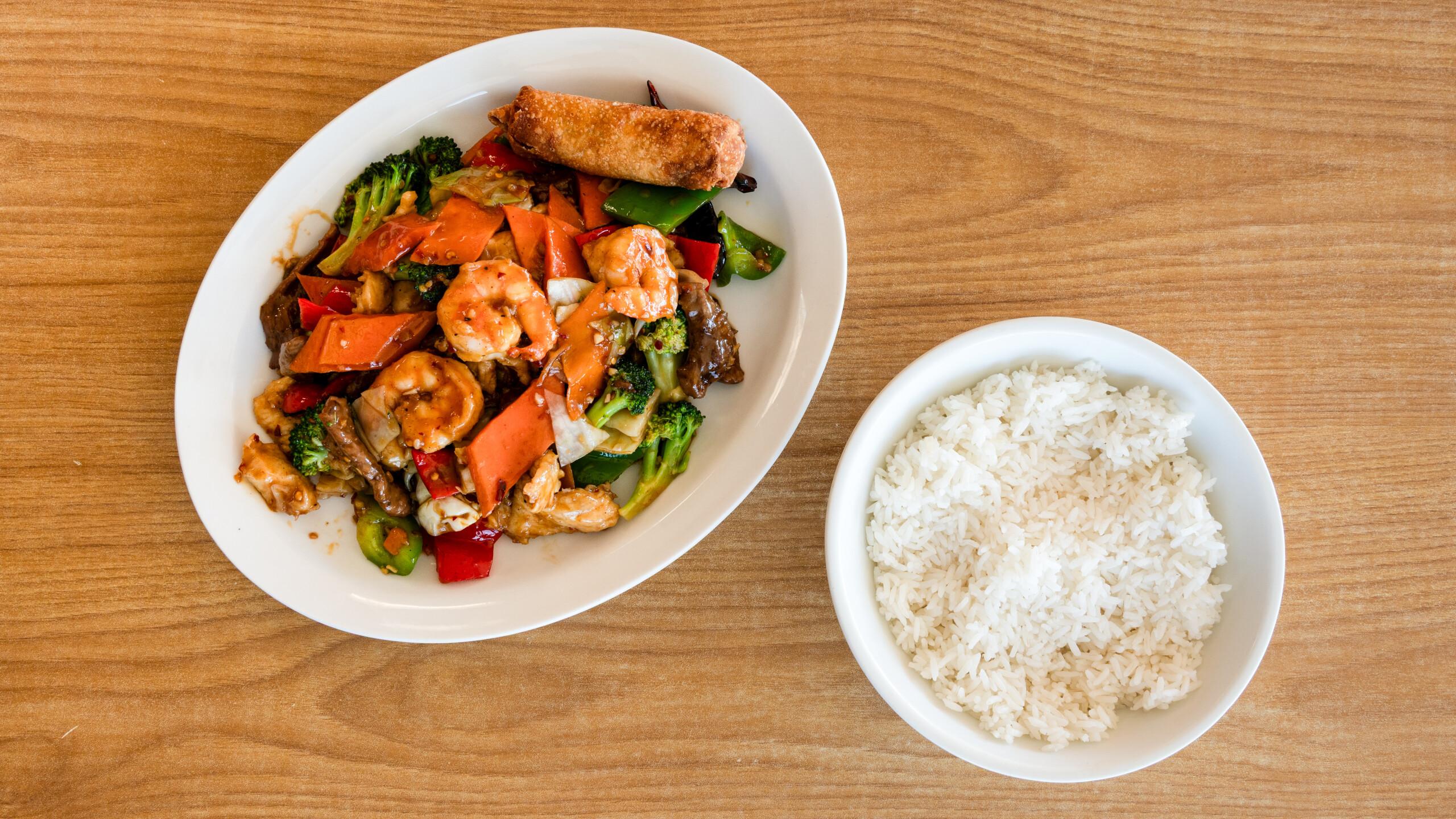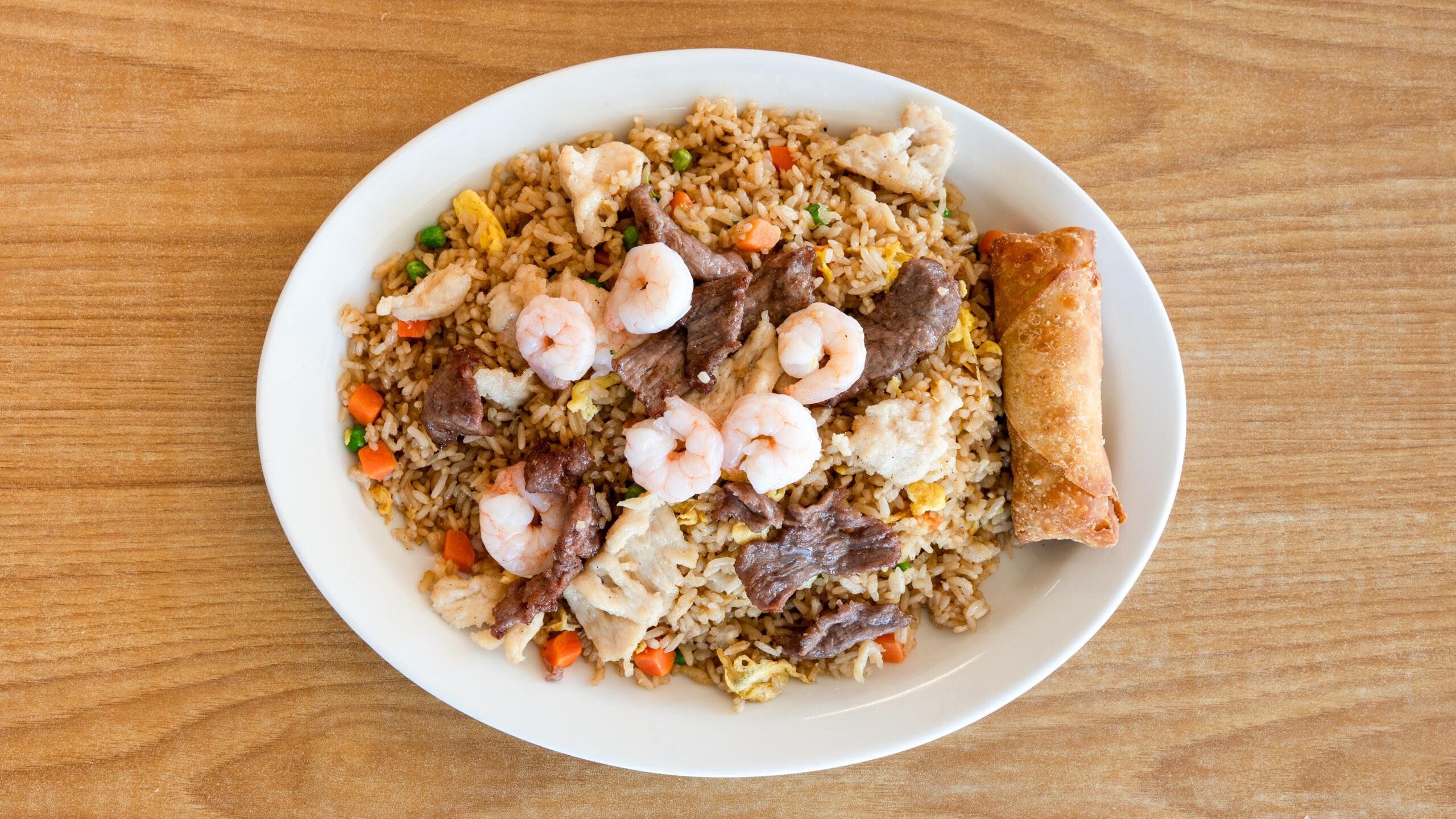 Chicken, beef, shrimp, and roast pork with mixed vegetables.