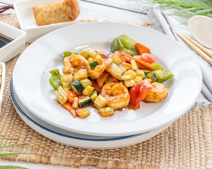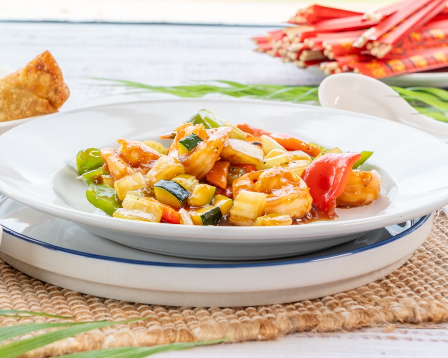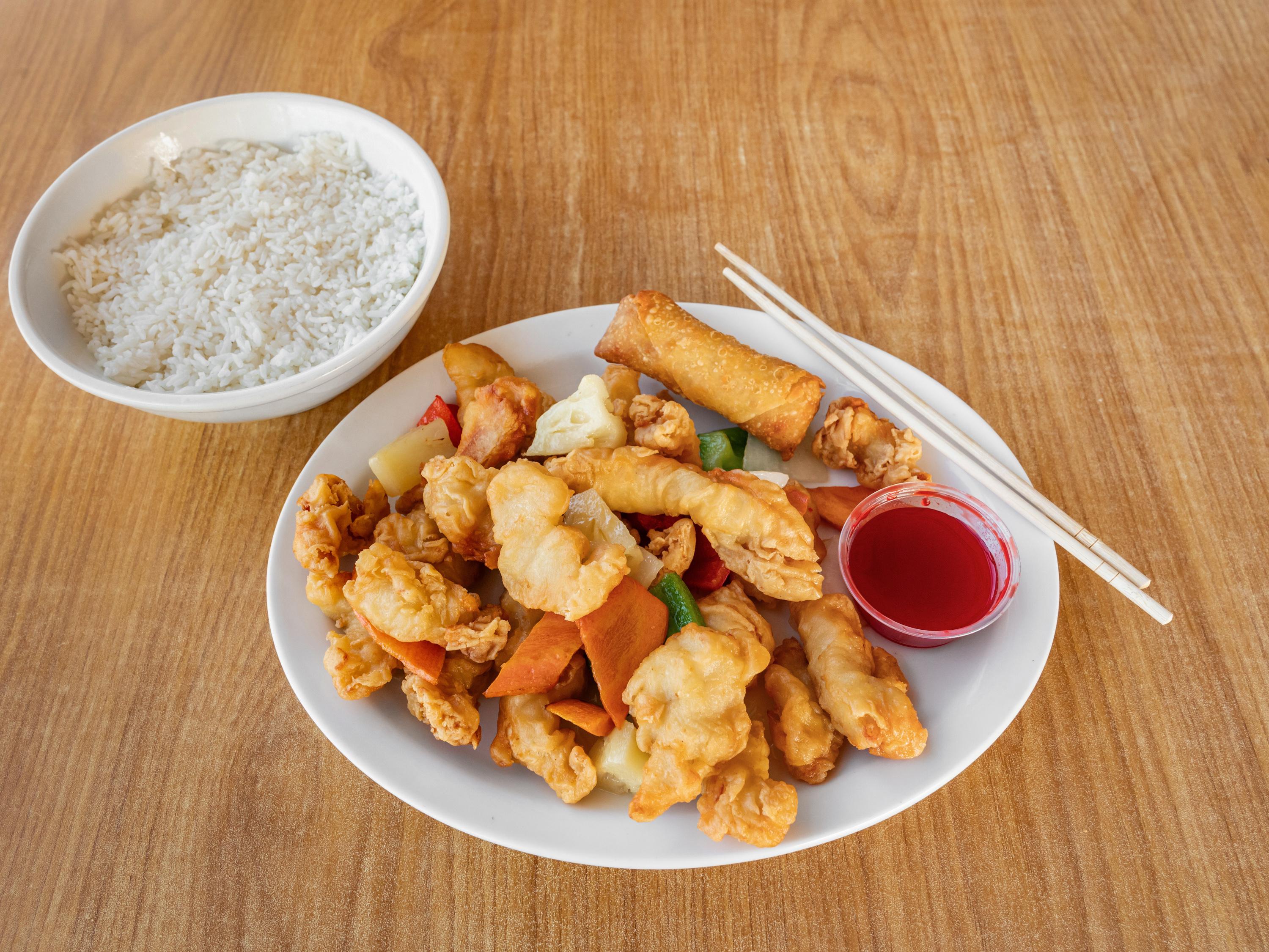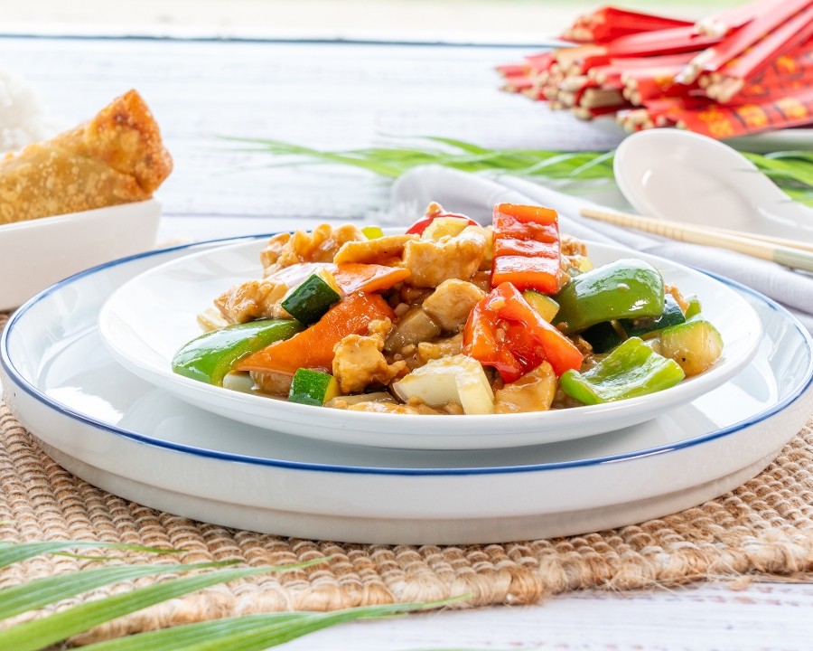 Carrots, onions, bell peppers, and deep-fried chicken with Mandarin sauce. 🌶