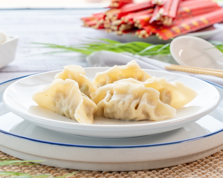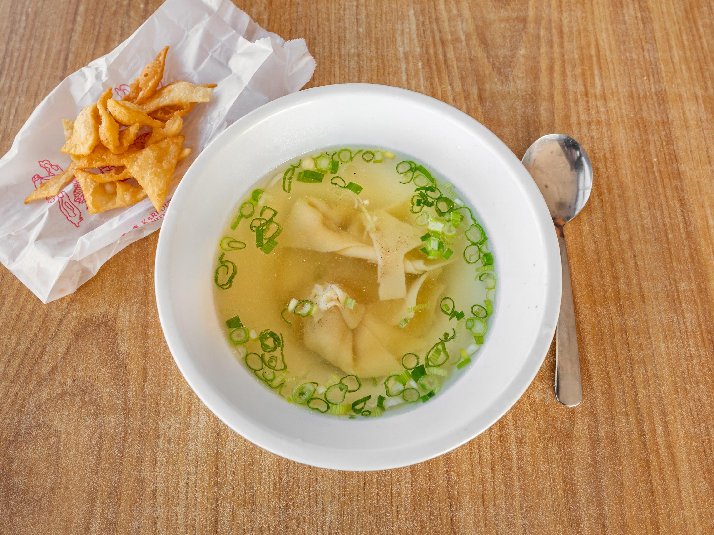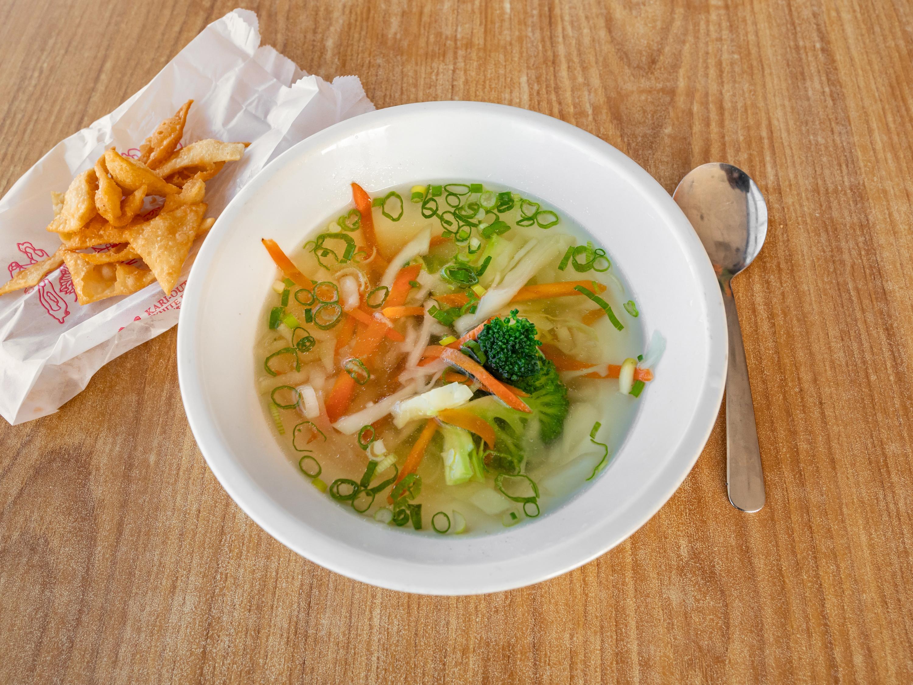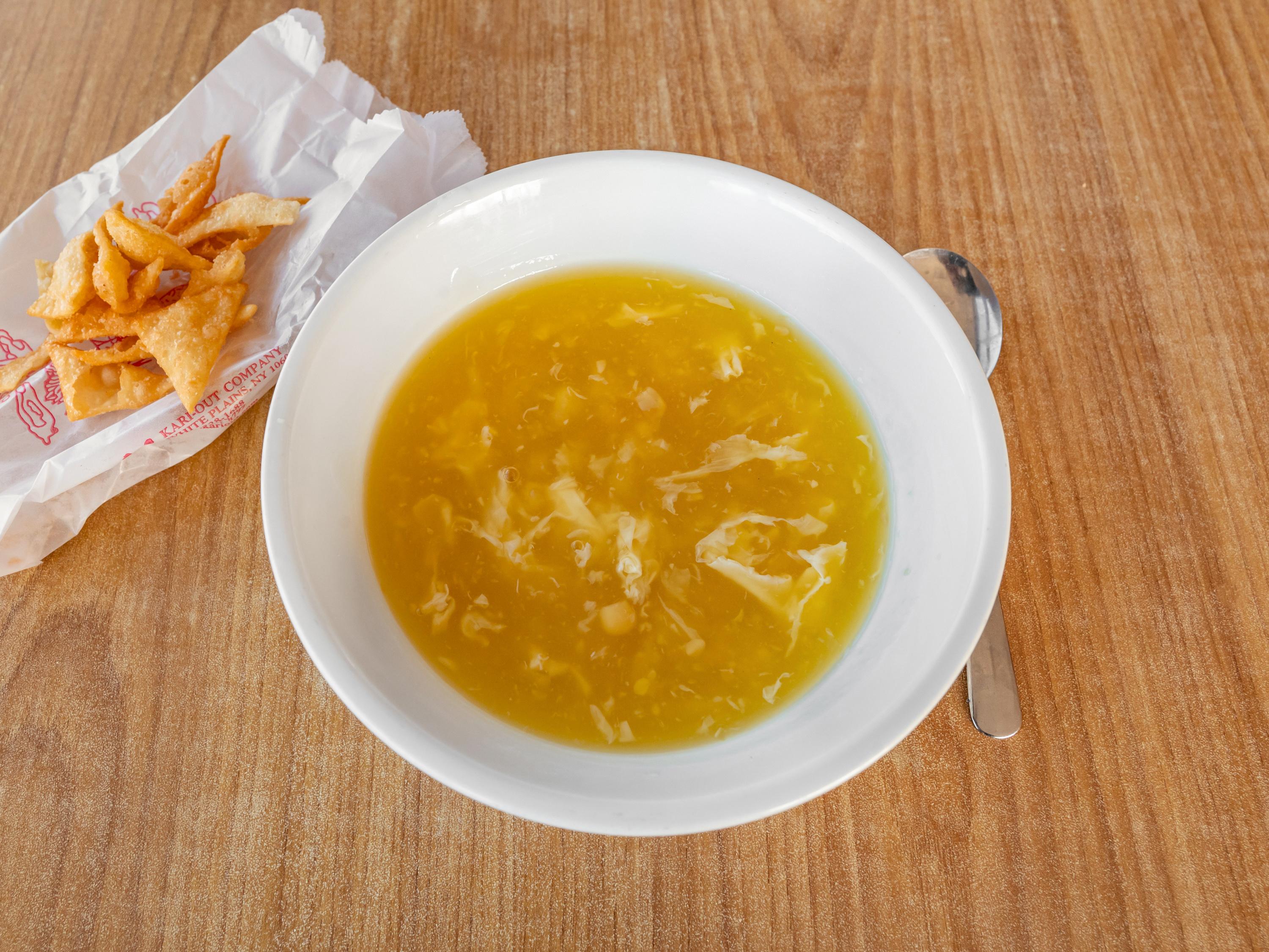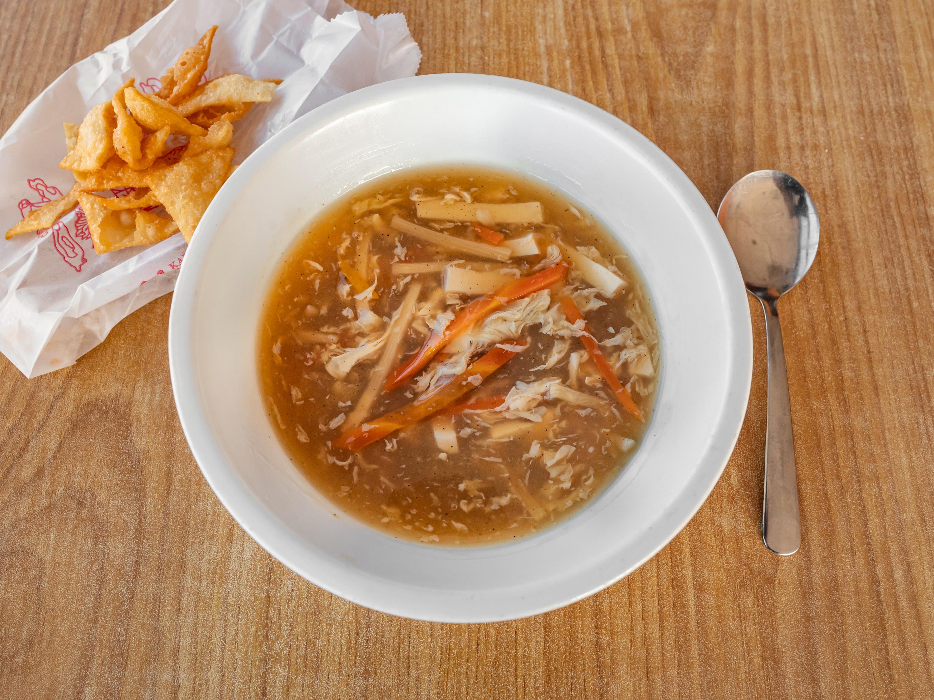 Two entrées, two egg rolls, two selections of soup, and four sugar biscuits.