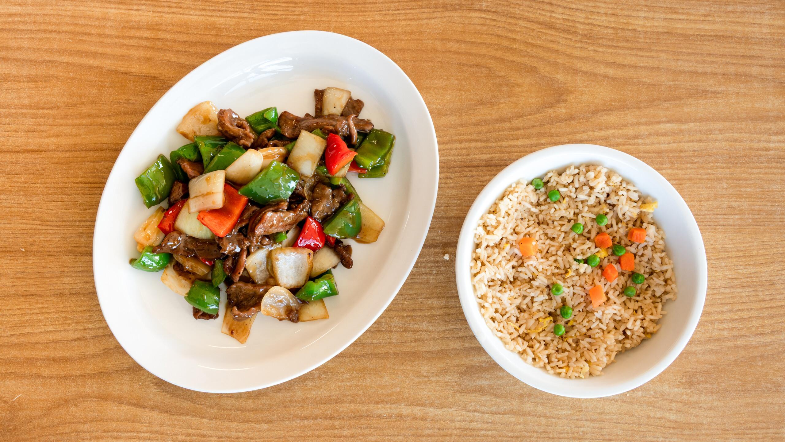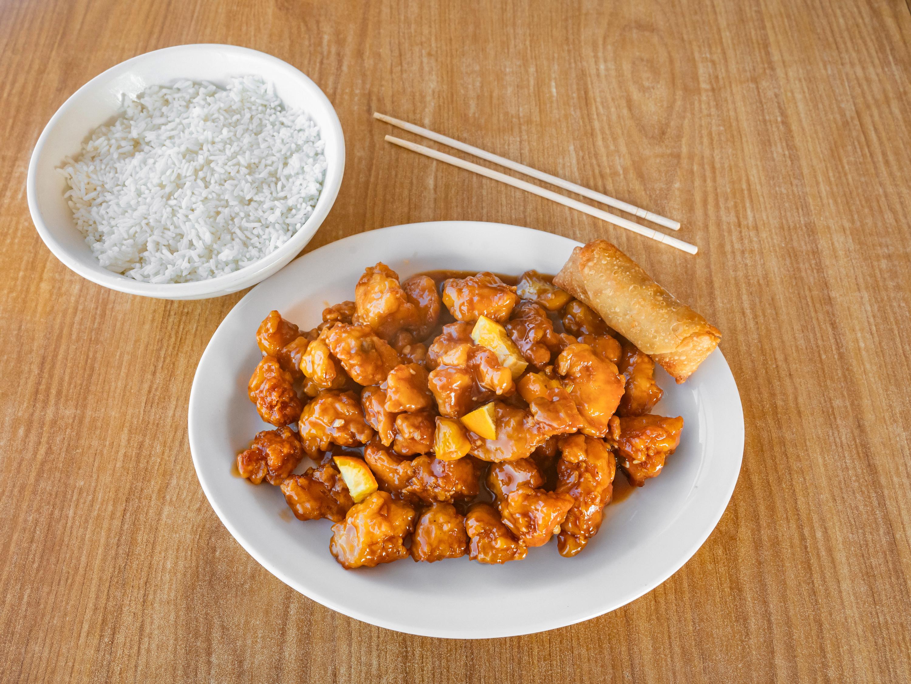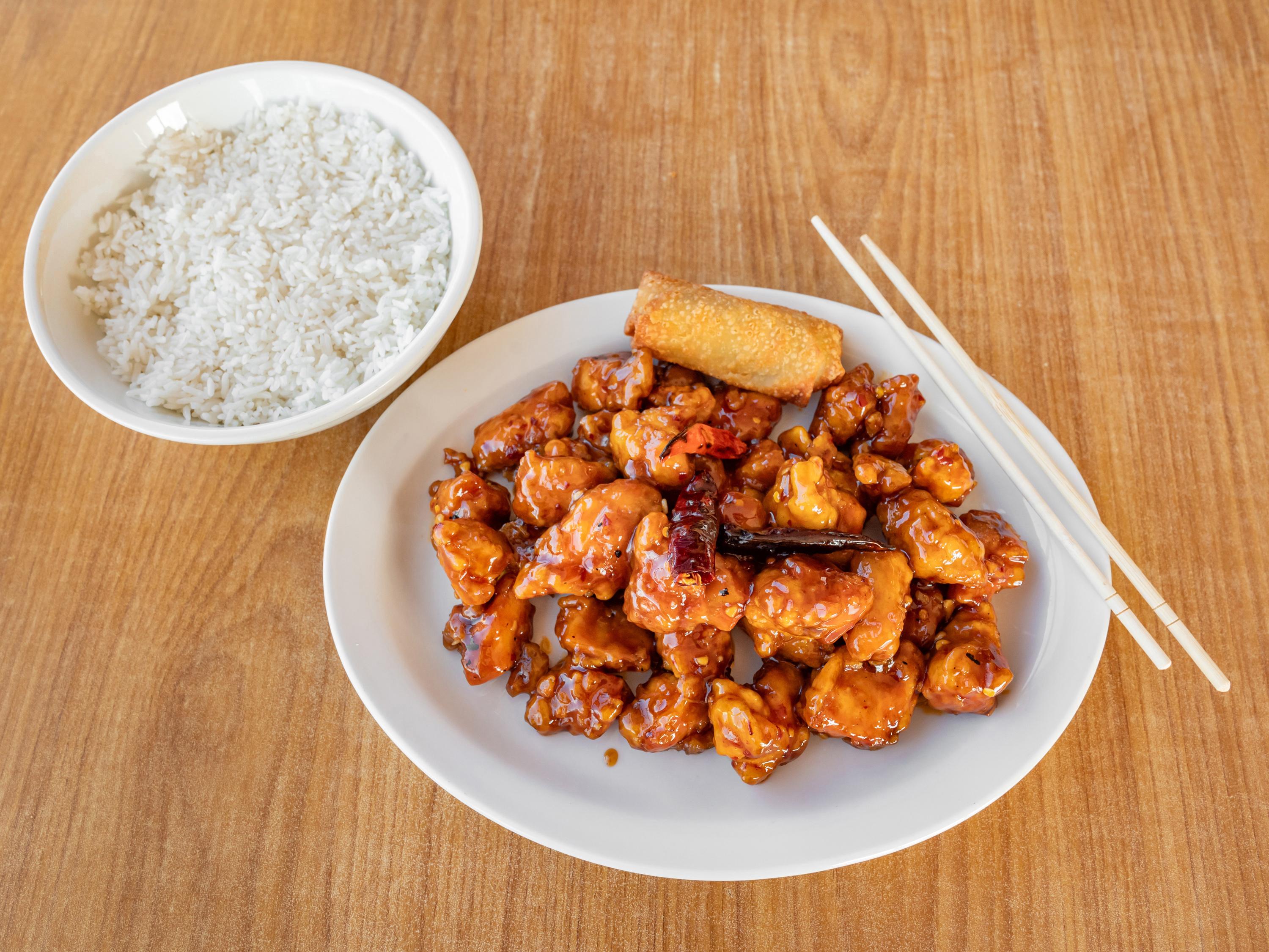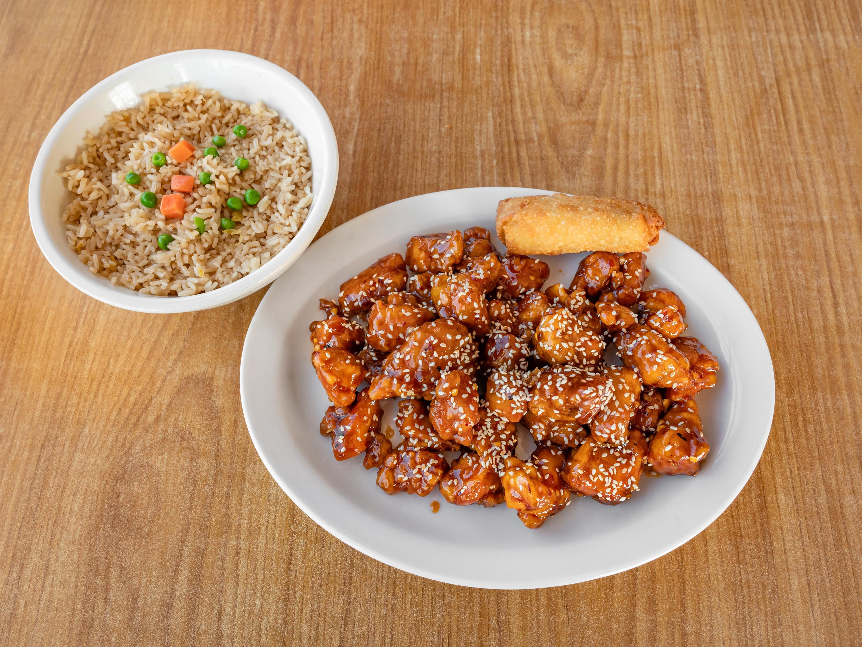 Sesame chicken features crispy, tender chicken pieces coated in a sweet and savory sesame sauce made with soy sauce, honey, garlic, and sesame oil. It's garnished with toasted sesame seeds for added texture. Choose between white rice, which is light and fluffy, or fried rice, offering a savory, slightly smoky flavor.