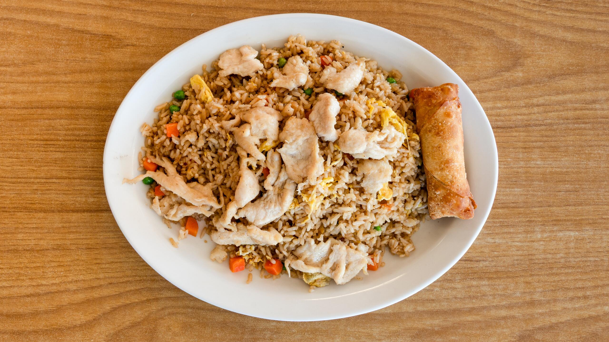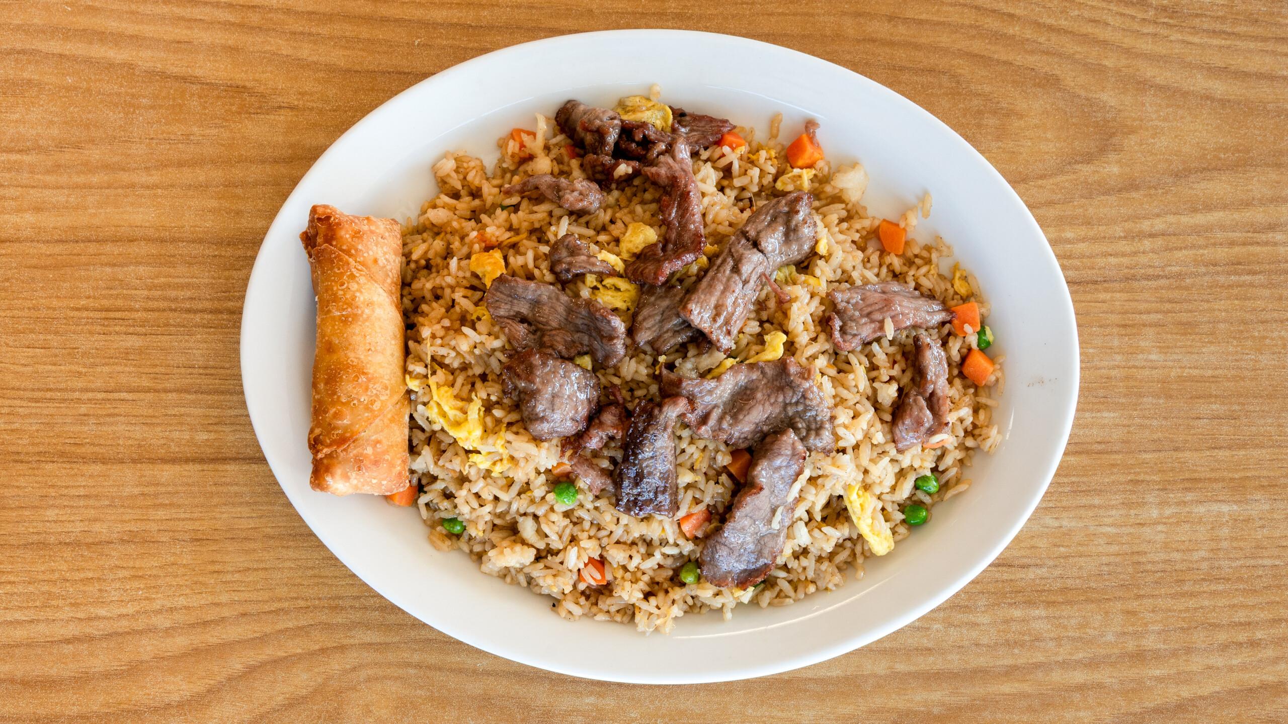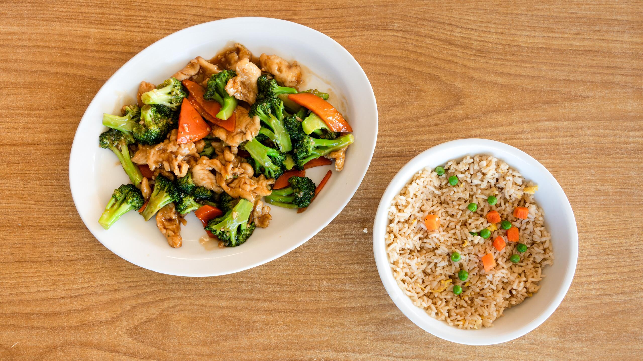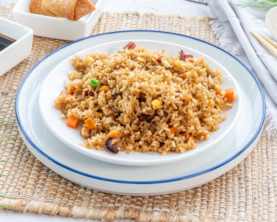 Sesame chicken features crispy, tender chicken pieces coated in a sweet and savory sesame sauce made with soy sauce, honey, garlic, and sesame oil. It's garnished with toasted sesame seeds for added texture. Choose between white rice, which is light and fluffy, or fried rice, offering a savory, slightly smoky flavor.