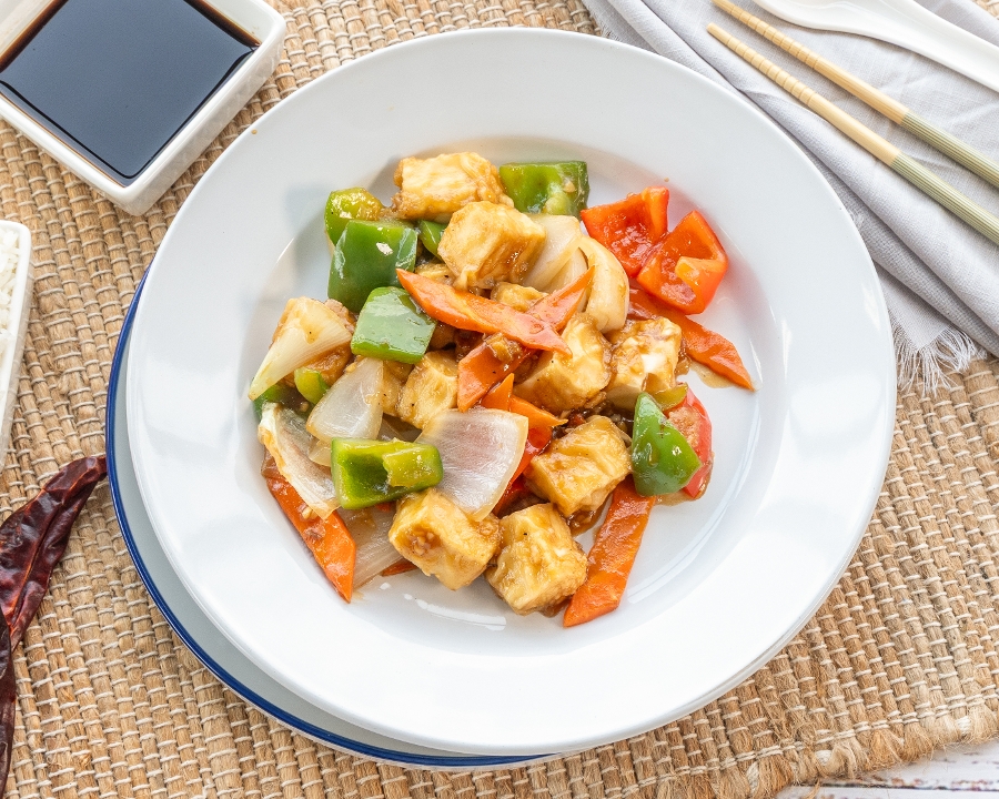 Bell peppers, onions, carrots, and bean curd in steak sauce. 🥬