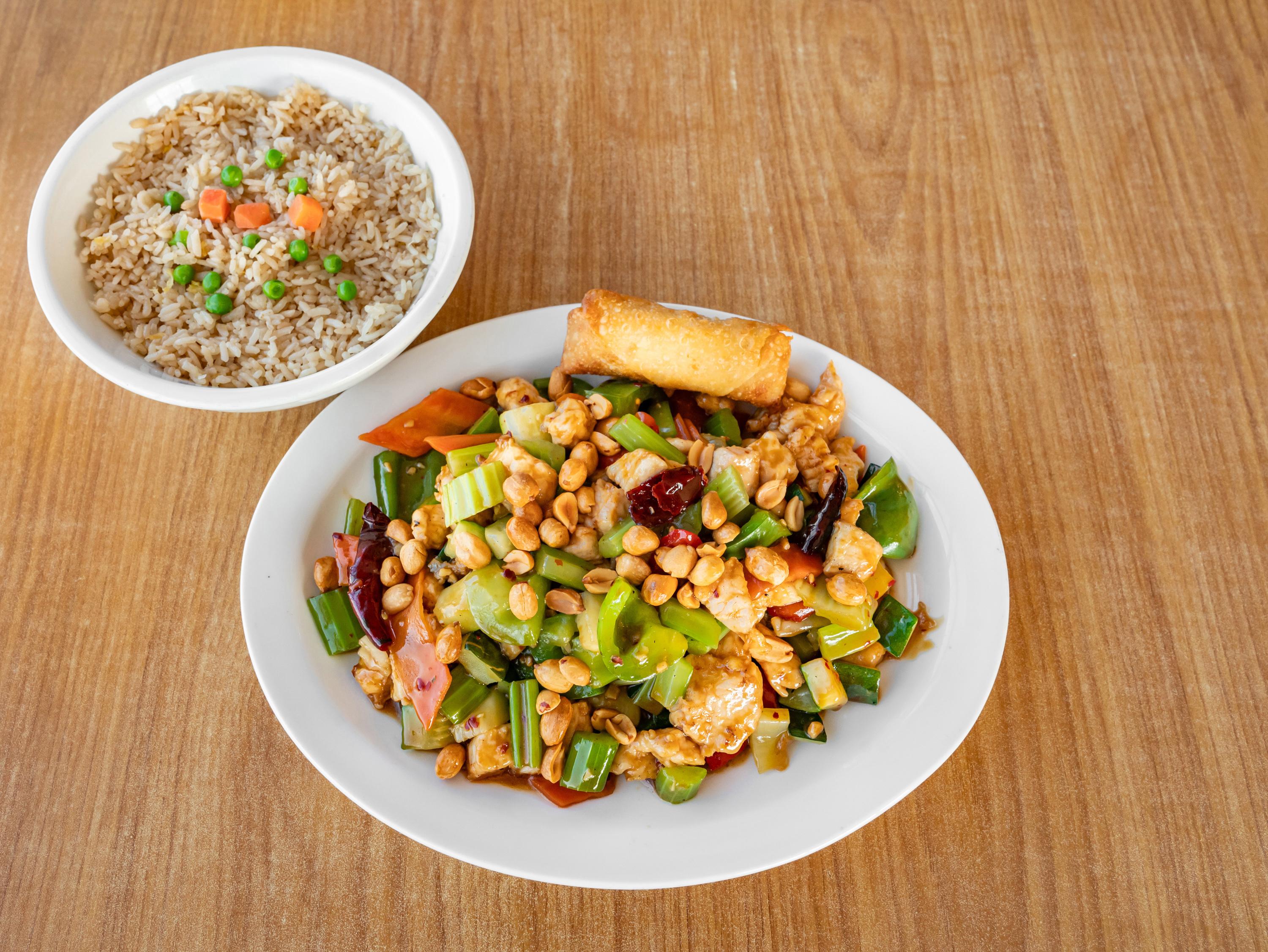 Celery, zucchini, carrots, bell peppers, and peanuts in Kung Pao sauce.🌶