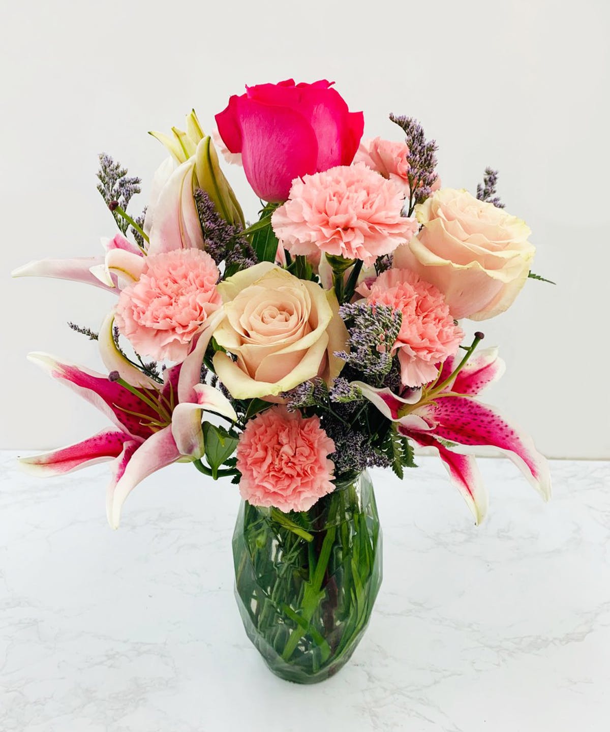 Everyone loves pink! Fragrant stargazer lilies, pink carnations and pink roses pop with pink in this delightful bouquet.