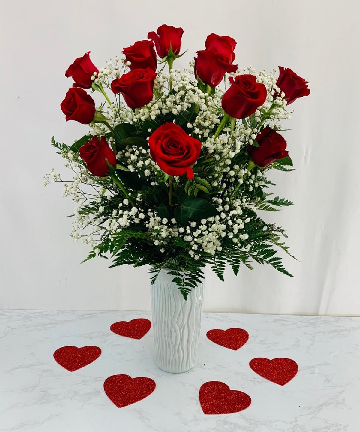One dozen of the finest Ecuadorian roses carefully hand selected and arranged in all their natural beauty in a vase with baby's breath. Vase may vary.