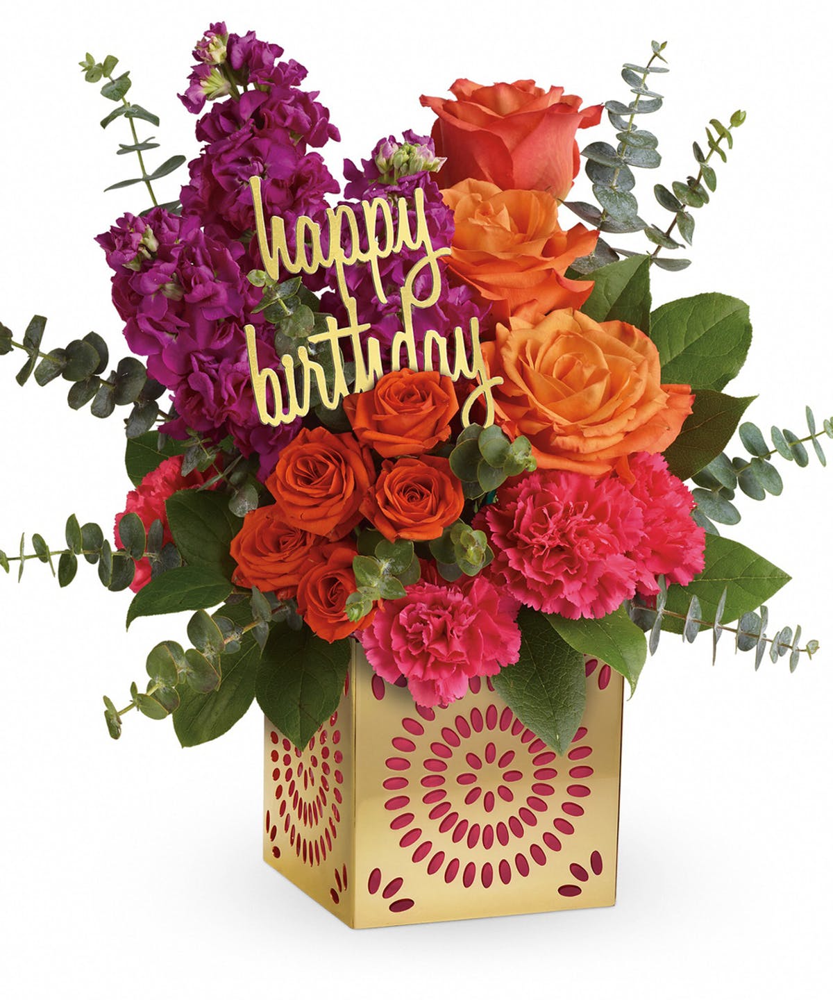 Make their special day sparkle! Surprise them with this beautiful bouquet of orange roses, fuchsia stock and pink carnations. The luxurious gift is hand-delivered in a shimmering metallic cube with intricate cutouts that later transforms into a gorgeous candleholder!